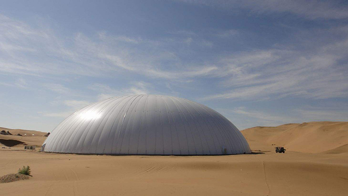 充氣膜結(jié)構(gòu)是一個相對密閉的空間結(jié)構(gòu),與傳統(tǒng)空間結(jié)構(gòu)建筑不一樣的是,它通過風(fēng)機向結(jié)構(gòu)內(nèi)部鼓風(fēng)送氣,使膜結(jié)構(gòu)內(nèi)外保持一定的壓力差,以保證膜結(jié)構(gòu)體系的剛度,維持所設(shè)計的形狀。